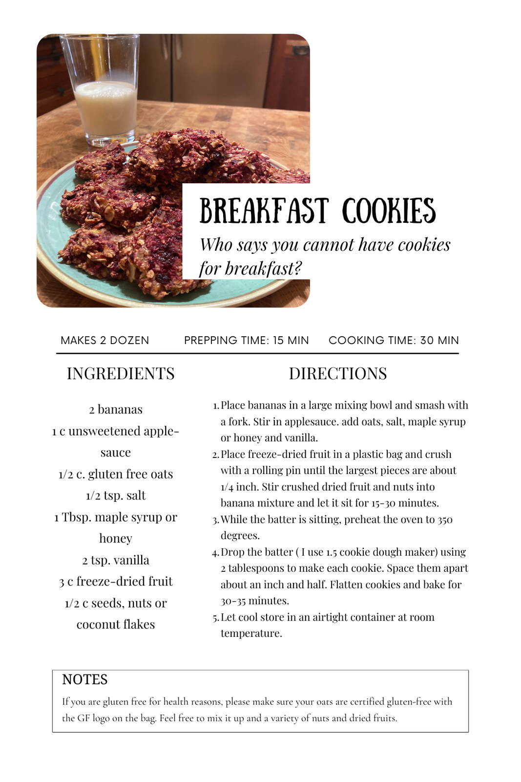 Yummy Breakfast Cookies. Who says you cannot have cookies for breakfast. Try pairing with milk or substitute milk for a complete protein. A great way to start off your day.
